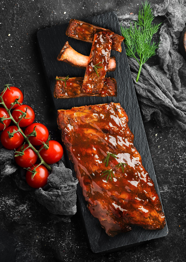 Les costelles de porc són confitades lentament a baixa temperatura durant més de 16h amb salsa bourbon. El producte es presenta envasat al buit i refrigerat (conservar entre 0ºc i 5ºc). Llest per escalfar i consumir.