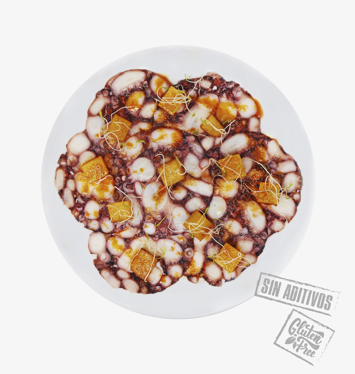 Potes de pop Octopus Vulgaris, cuit i moldejat amb la seva propia gelatina. Es presenta tallat a fines làmines i racionat en sobre de porció individual.