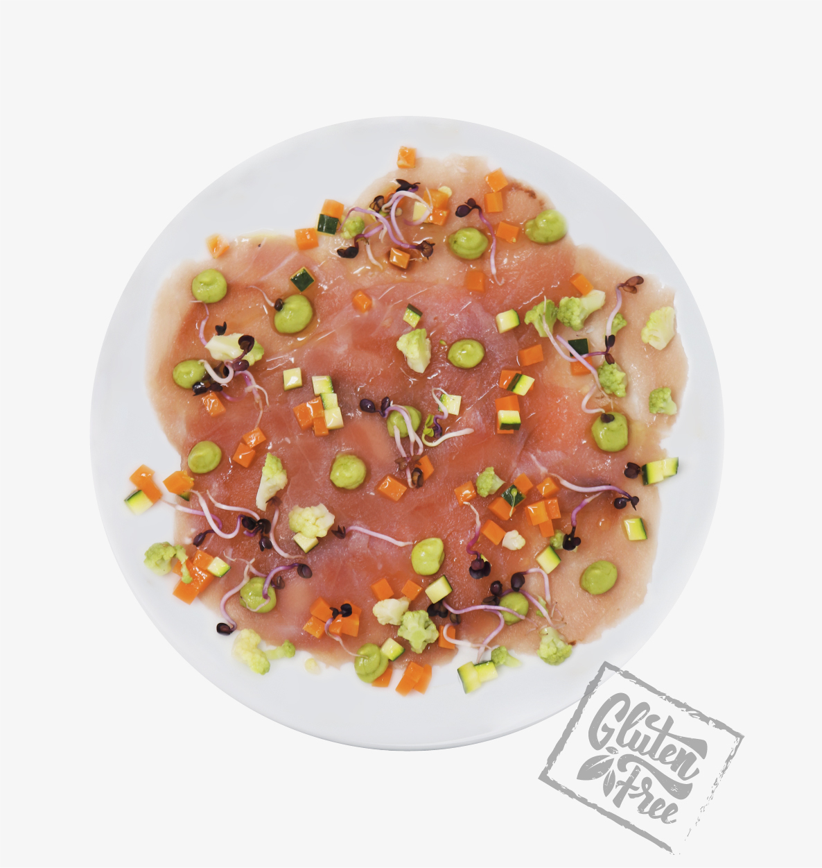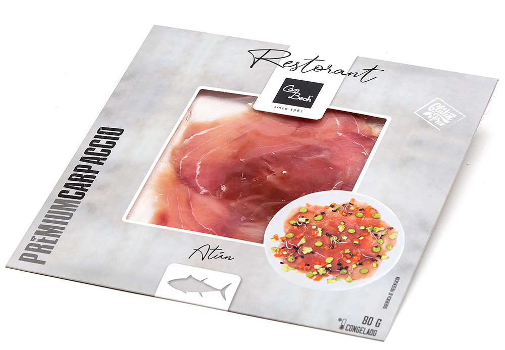 Tonyina (Thunnus Albacares) tallada a fines làmines i presentada en sobre de ració individual, ideal com a entrant i per a compartir.