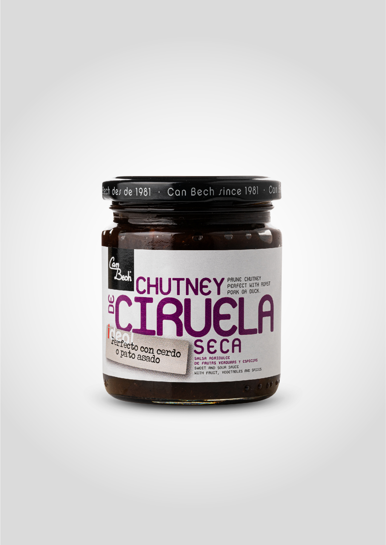 Chutney de prunes seques amb avellanes, curri, canyella i vinagre. Els chutneys són agredolços fets a partir de fruites, verdures i espècies. Nosaltres els hem adaptat a l'estil mediterrani amb espècies pròpies de la nostra cuina, fent-los més harmoniosos i no tan picants com les receptes originals procedents de l'Índia.
