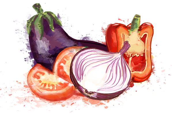 Tomàquets, cebes, albergínies, pebrots vermells, sucre, vi blanc, pebrots verds, sal, i pebre vermell.