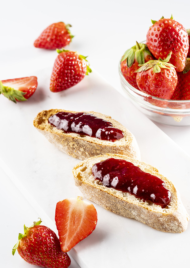 maduixa 60%, sucre, suc de llimona, gelificant (pectines) i concentrat (raïm vermell).